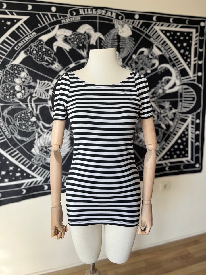 Çizgili t-shirt. Geniş yakalıdır, likralı, iki koltuk altı arası 36 cm, uzunluğu 65 cm. Xs ve s bedene uygundur