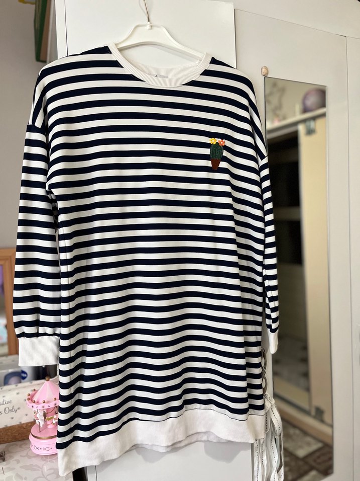 Pamuklu, çizgili ve düğmeli detaylı, yuvarlak yaka, bol kesim uzun kollu kadın tişörtü. Rahat sokak stili için uygundur. Hiç kullanılmadı