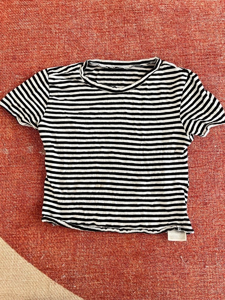 Bana olmuyor diye satıyorum Dar kesim tişört, kısa kollu ve kayık yaka, siyah beyaz çizgili desende, yumuşak tekstil kumaştan, trend sokak stili için uygundur.