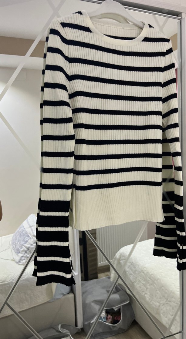 Çizgili desenli, uzun kollu, bisiklet yaka, triko kumaştan yapılmış, normal midi uzunlukta, günlük kullanıma uygun, ince kesim kadın kazak.