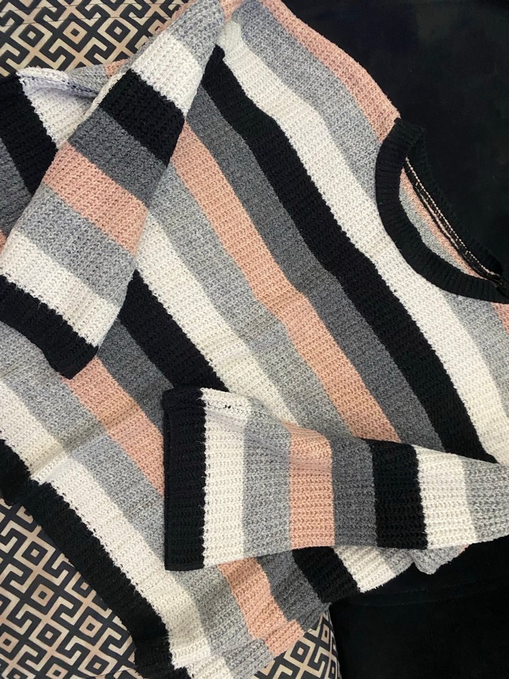 Çizgili desenli, uzun kollu, triko kadın kazak. Salaş kesim ve kayık yaka ile rahat bir kullanım sunar. Gri ve yumuşak renk tonlarında, günlük sokak stili için uygundur.