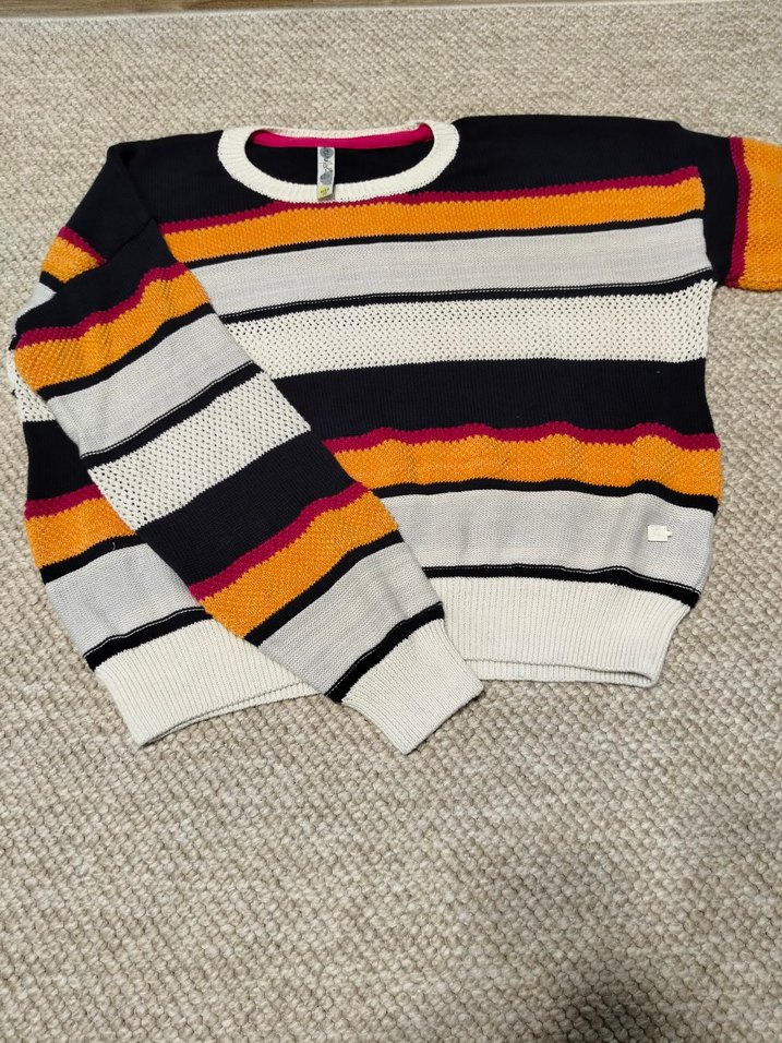 hıc gıyılmedı sıfır Bol kesim, uzun kollu, yuvarlak yaka kadın kazak. Çok renkli çizgili triko dokusu bulunur. Günlük ve sokak stiline uygundur.