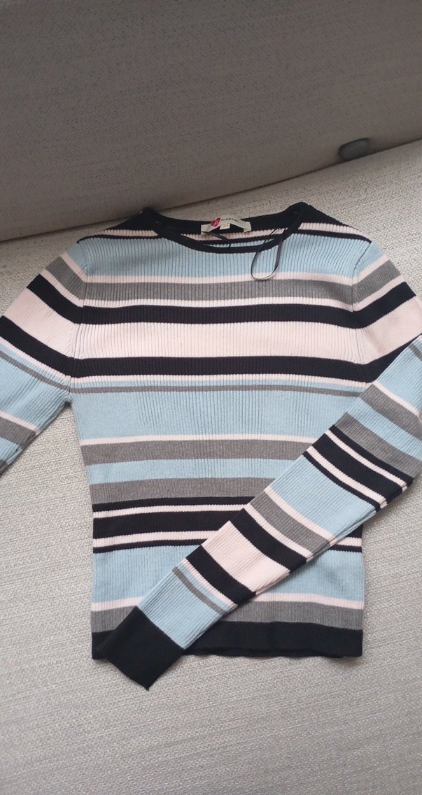 Uzun kollu, bisiklet yaka, çizgili triko kazak. Gri, mavi ve siyah pastel tonlarında, günlük ve rahat stil için uygundur.