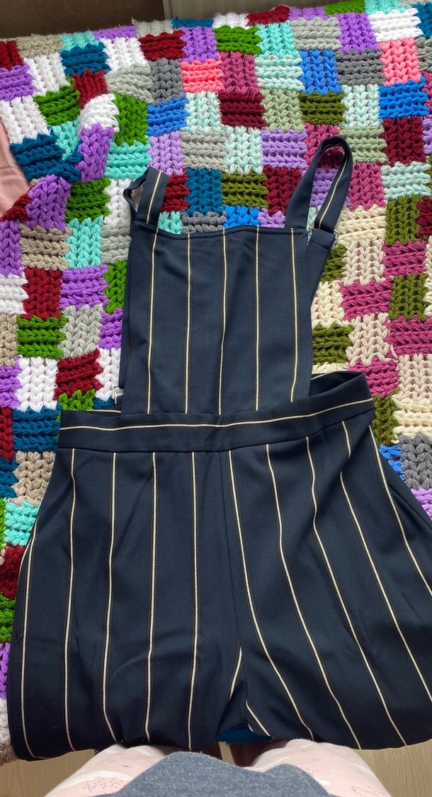 Çizgili, triko dokulu kız tulum. Koyu renklerde ve askılı, rahat kesimli, sokak tarzına uygun.