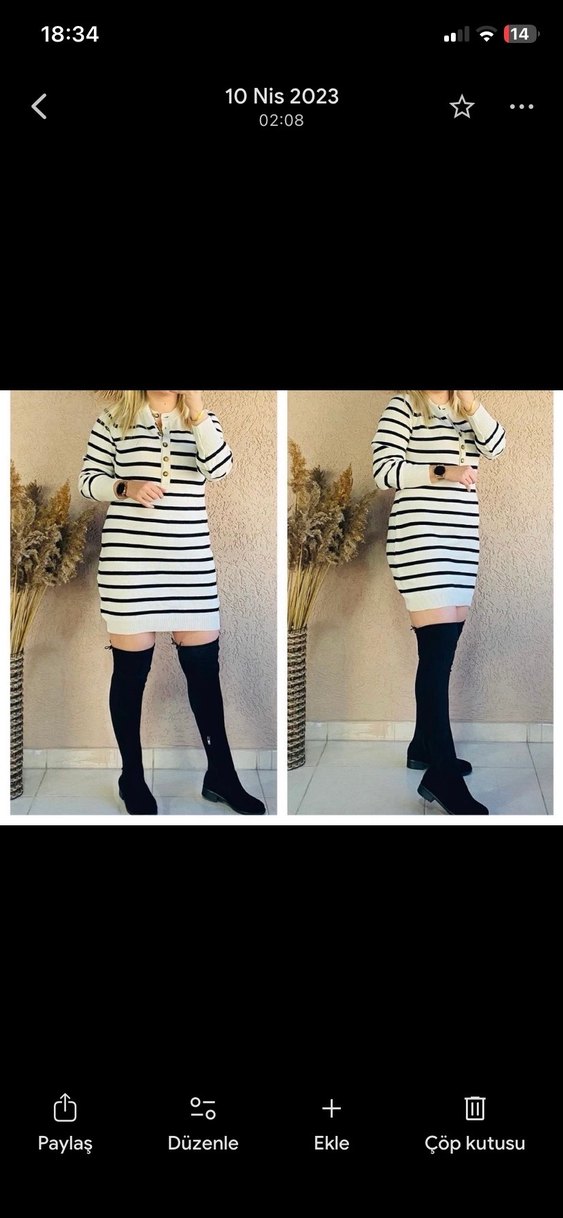 Uzun kollu, yüksek yakalı ve çizgili beyaz-siyah triko midi elbise, rahat ve günlük kullanıma uygun.