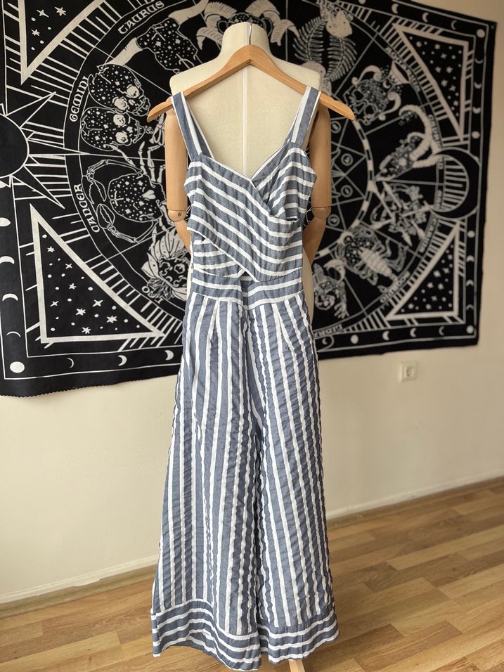 Çizgili desene sahip, rahat kesim tulum. Bel kısmı dekoltelidir. M diyor fakat S beden uyumlu. Hiç giyilmedi etiketini çıkardım ve yıkadım sadece. İki koltuk altı arası 32 cm ve lastikli, uzunluğu 126 cm