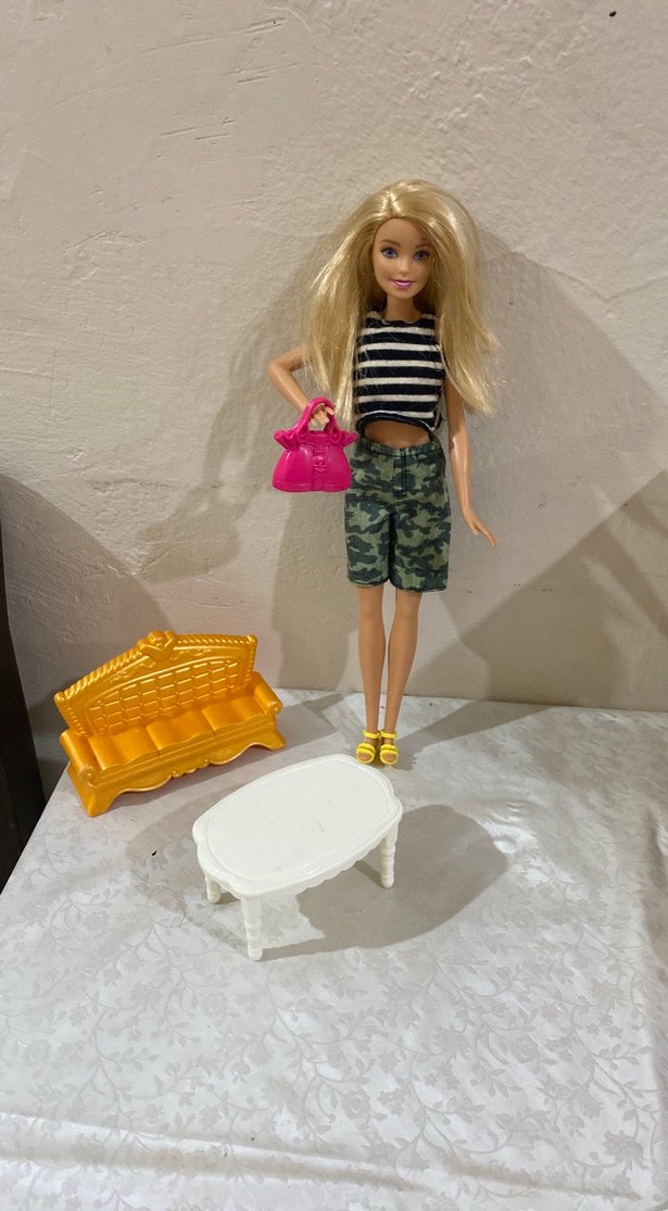 Bu bebek, çizgili kolsuz üst ve kamuflaj desenli şort giymekte, uzun sarı saçlı ve açık tenlidir.