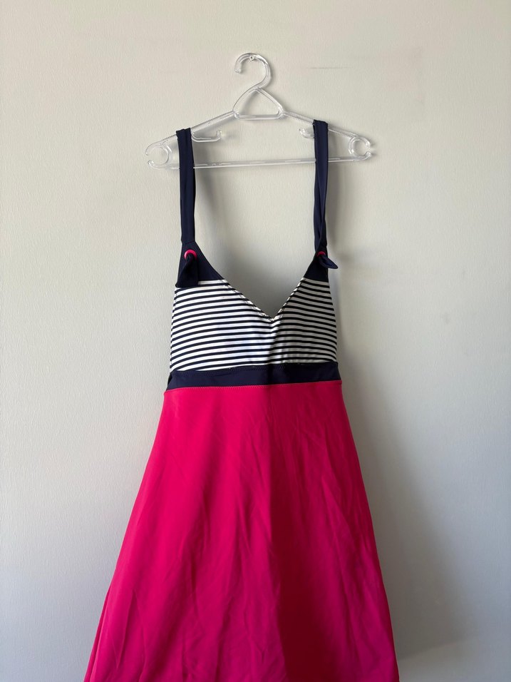 Kadın mayo, çizgili üst kısmı ve pileli pembe midi etek kısmı ile dikkat çeker. İnce askıları ve vücuda oturan kesimiyle plajda şık bir görünüm sunar.