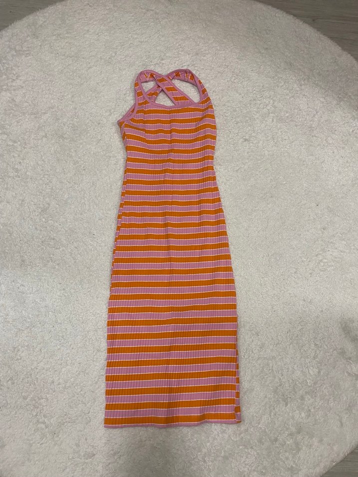 Bu vücuda oturan midi boy elbise, ve askılıdır. Pastel çizgili desenlere sahiptir ve fitilli tasarımıyla bohem tarzda gündelik kullanım için uygundur.