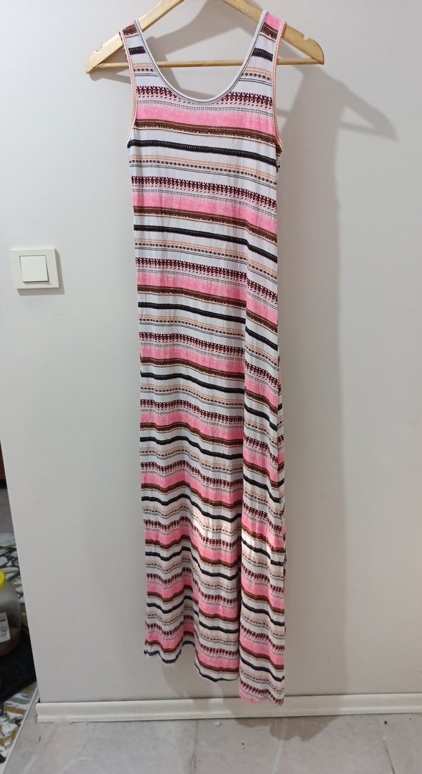 Pastel renkli çizgili, uzun bohem elbise. Kayık yaka ve ince askılarla günlük kullanıma uygundur. hic kullanilmadi