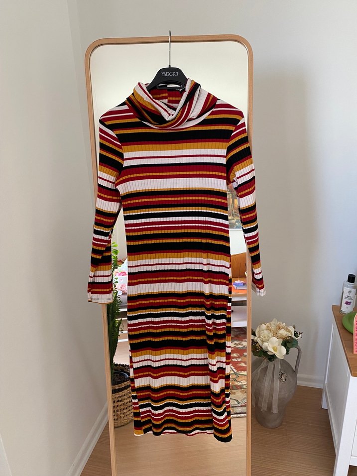 Renkli çizgili, uzun ve fitted kesim triko elbise. Yüksek yakalı ve uzun kollu, günlük kullanıma uygun rahat bohem tarzda. Minik bir lekesi var fotoğrafta mevcut