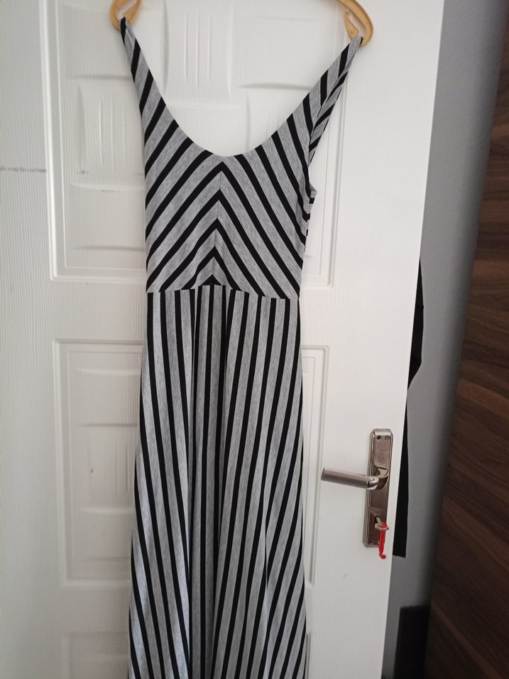 Kolsuz, kayık yaka uzun elbise, çizgili ve pileli detaylara sahip. Sentetik kumaştan yapılmış, gri renkte ve günlük kullanıma uygun.