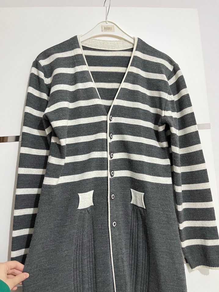 Çizgili desenli, V yaka ve düğmeli uzun gri hırka. Yün malzemeden üretilmiş, rahat kesim ve uzun kollu, rahat ve şık bir görünüm sunar.