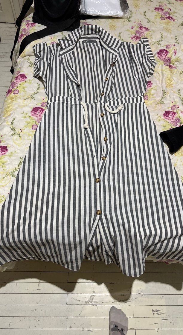 Gri beyaz çizgili, bol kesim ve askılı kollu uzun hamile sabahlığı. V yaka ve ön düğmeli, rahat kullanım sağlar.