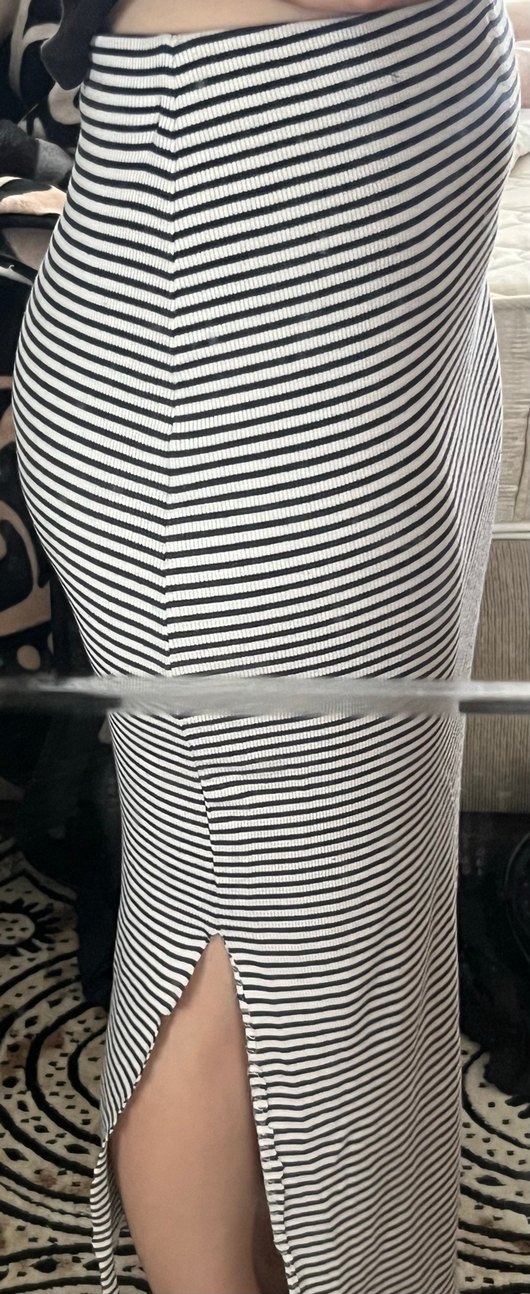 Gri beyaz çizgili, yırtmaçlı, uzun ve vücuda oturan hamile eteği, yumuşak sentetik kumaştan üretilmiştir.