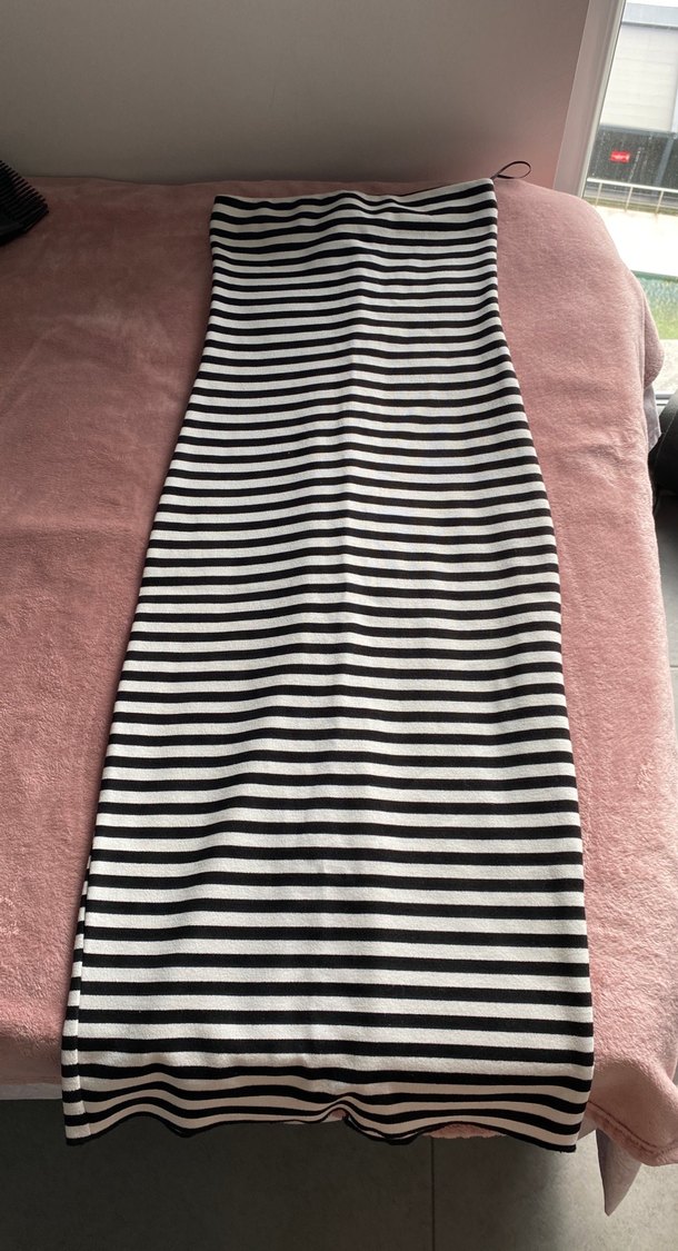 Viskoz polyester karışımlı çizgili, vücuda oturan uzun elbise, arkası yırtmaçlı. Günlük kullanıma uygun, Paris sokak modasını yansıtan şık bir parça.