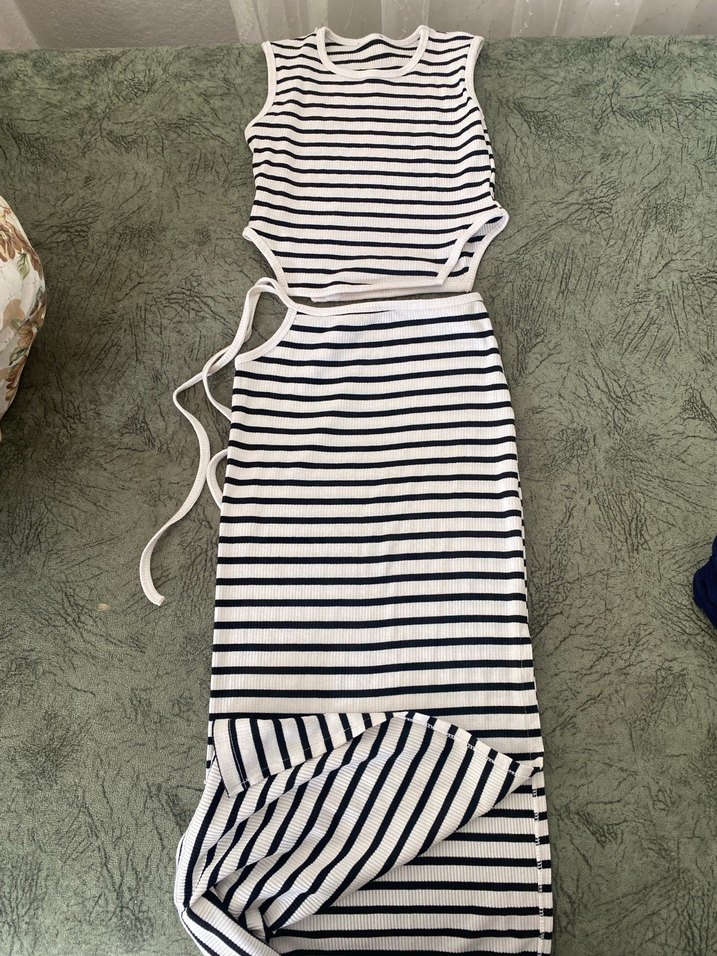 Halter yaka ve yırtmaçlı, yumuşak sentetik kumaştan yapılmış çizgili, uzun ve vücuda oturan elbise. Sokak modasına uygun.
