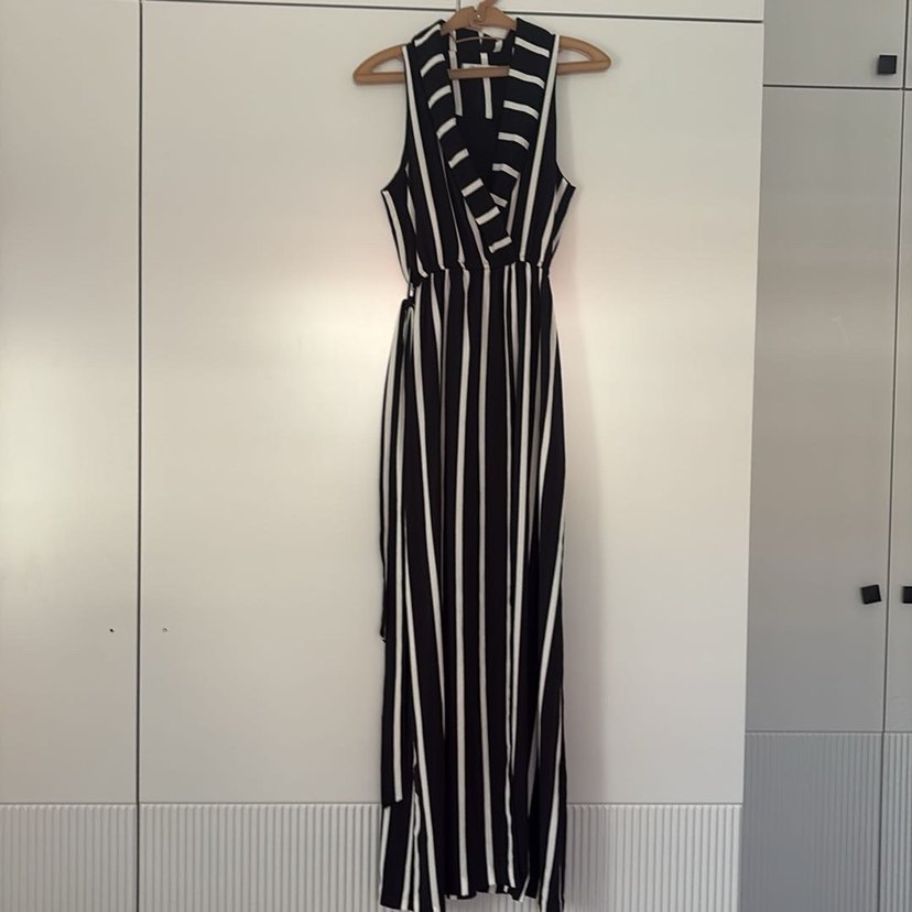 V yaka ve ince askılı, siyah beyaz çizgili uzun kadın tulum. Pilili tasarım ve rahat kesim, yumuşak sentetik kumaştan üretilmiştir. Sokak stili için uygundur.