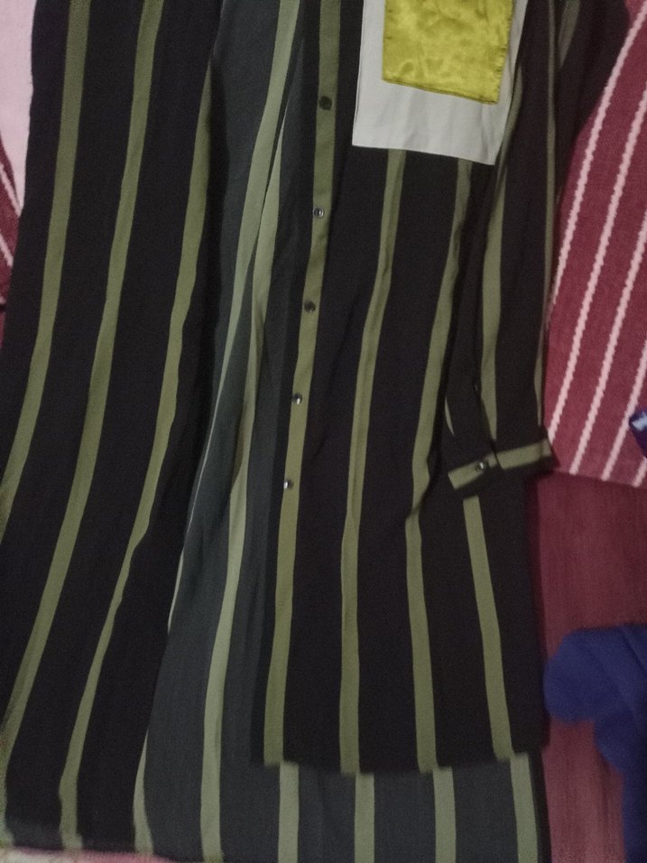 Çizgili desenli, uzun ve düğmeli kadın gömleği, kesik yaka ve uzun kolludur. Sentetik kumaştan, regular fit ve sokak stilindedir. Günlük kullanım için uygundur.