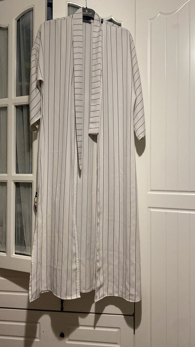 Çizgili gri ve beyaz renkte, kısa kollu, regular fit uzun kadın sabahlığı, Paris sokak modasını yansıtıyor.