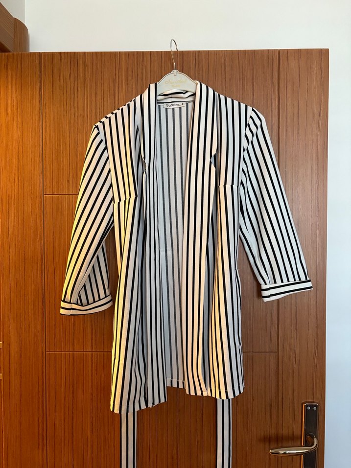 Uzun, çizgili desene sahip, uzun kollu ve regular fit kadın sabahlığı. Paris tarzı sokak giyimine uygun.