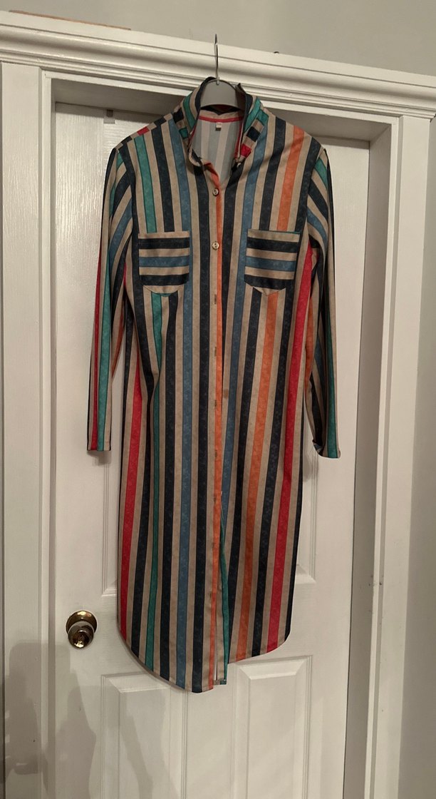 Kadınlar için düğmeli, yakalı ve uzun kollu, çok renkli çizgili desenli, sentetik kumaştan yapılmış bohem tarzı uzun elbise.