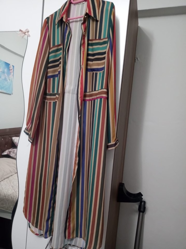 Uzun kollu, kayık yaka ve pileli çizgili desenli, hafif renkli bohem tarz kadın tunik. Rahat kesim ve uzun boy, yumuşak sentetik