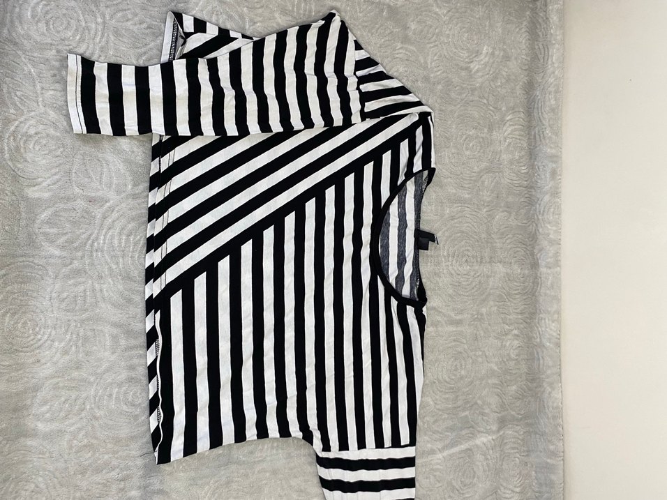 Fitted kesim, uzun kollu ve bisiklet yaka crop bluz, siyah beyaz çizgili. Hiçbir deformesi yoktur