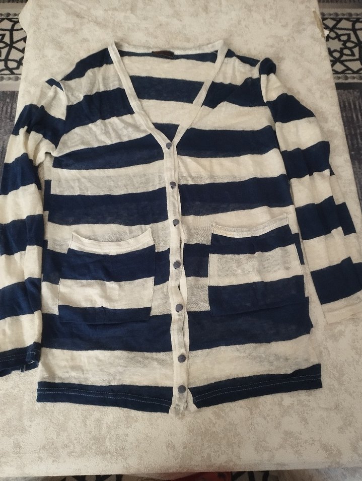 Düğmeli, uzun kollu, bol kesim hırka, geniş yatay lacivert ve beyaz çizgilerle. Nefes alan keten kumaştan, iki ön cepli ve V yakalı. Günlük kullanım için uygundur.