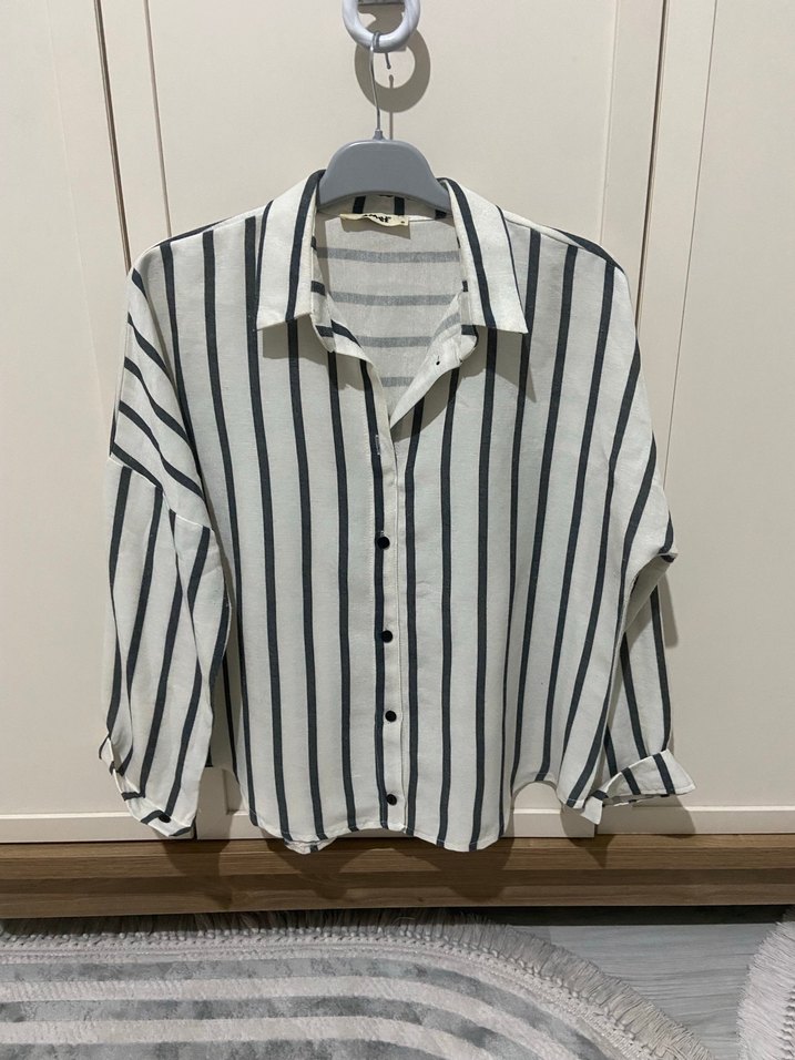 Gri beyaz çizgili, uzun kollu, düğmeli ve yakalı kadın gömleği. Rahat kesimi ve keten kumaşıyla günlük sokak stiline uygundur.