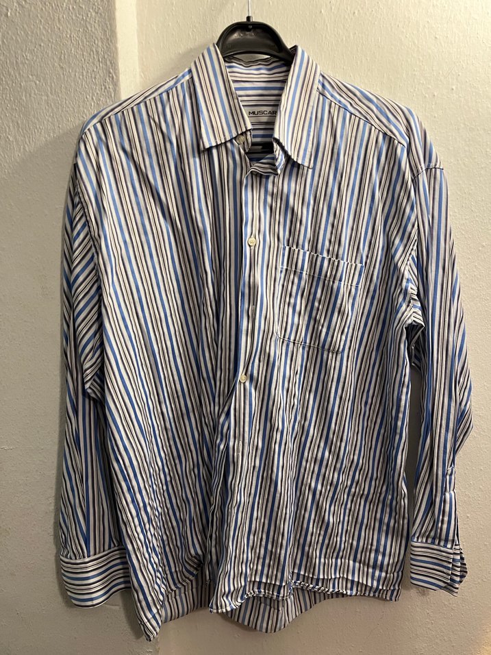 Uzun kollu, düğmeli, keten kumaştan yapılmış, çok renkli koyu çizgili, bol kesim erkek gömleği. Ofis ve günlük kullanıma uygun.