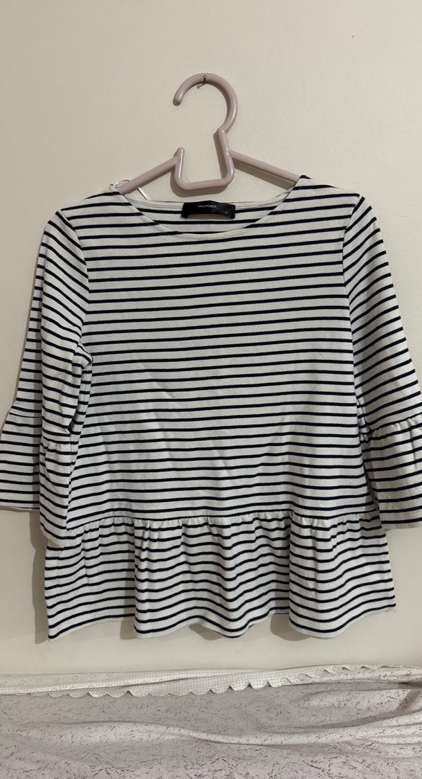 Pamuk kumaştan, uzun kollu ve salaş kesim olan bu kadın bluz, beyaz zemin üzerine gri çizgilerle ve etek kısmında fırfır detayına sahiptir. Günlük kullanıma uygundur.
