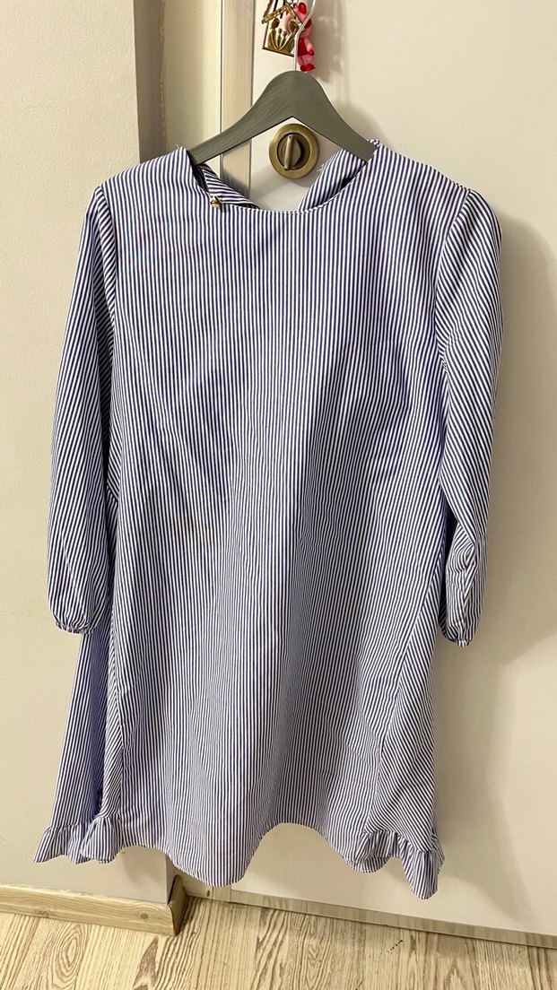 Mavi ve gri çizgili hamile tunik, uzun kollu ve yüksek yakalıdır. Keten kumaştan, normal boyda ve pilili detaylara sahiptir. Günlük kullanıma uygundur.