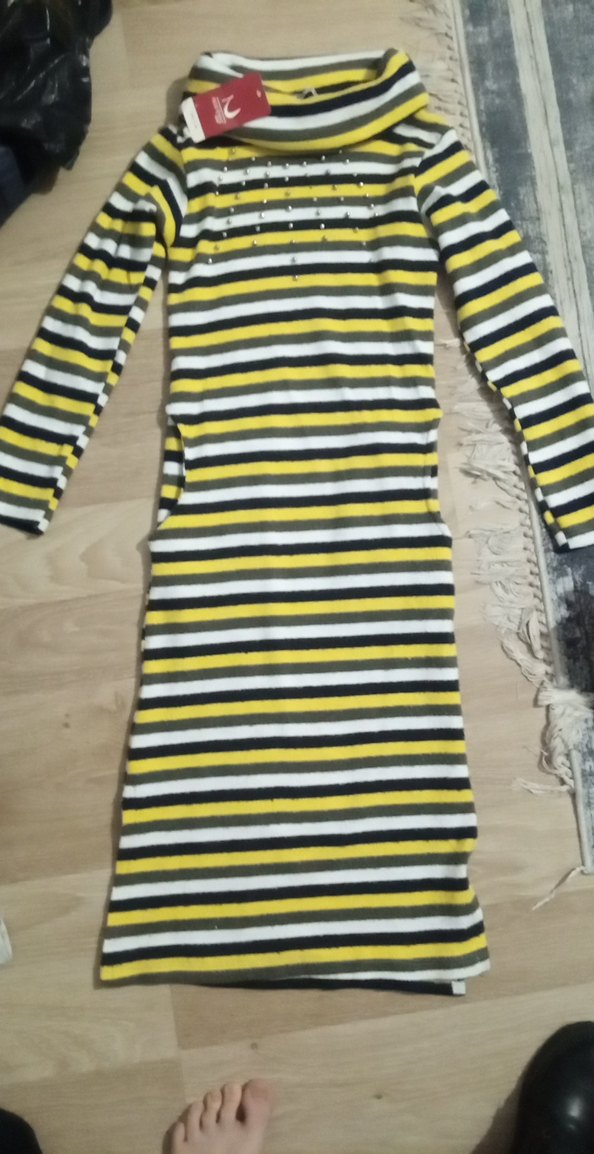 Sarı, gri ve beyaz çizgili, uzun kollu ve tekne yaka, vücuda oturan uzun elbise. Yırtmaç detayı ve sentetik kumaş kullanılmış, günlük rahat stil için uygun. yeni etiketli 14 yaş ama s beden olarakda giyilir esnek kumaşa sahip cepli