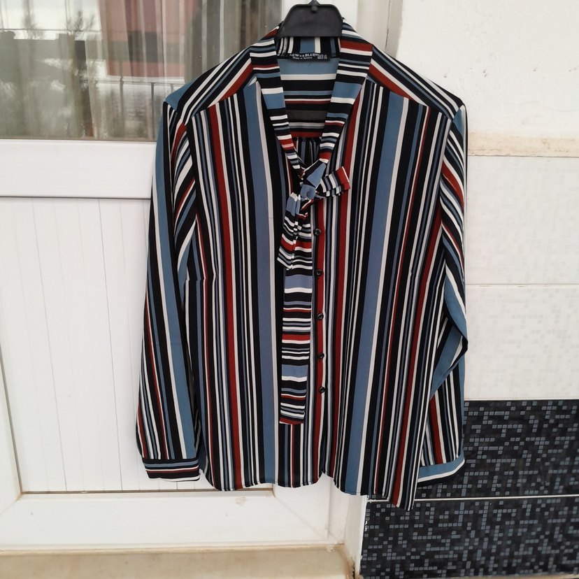 Uzun kollu, yakalı ve düğmeli kadın gömlek. Regular kesim, uzun boy ve koyu renkli çok renkli çizgili desenlidir. Ofis için uygundur. Arkasında kupasında belli belirsiz baskı hatası var sadece.