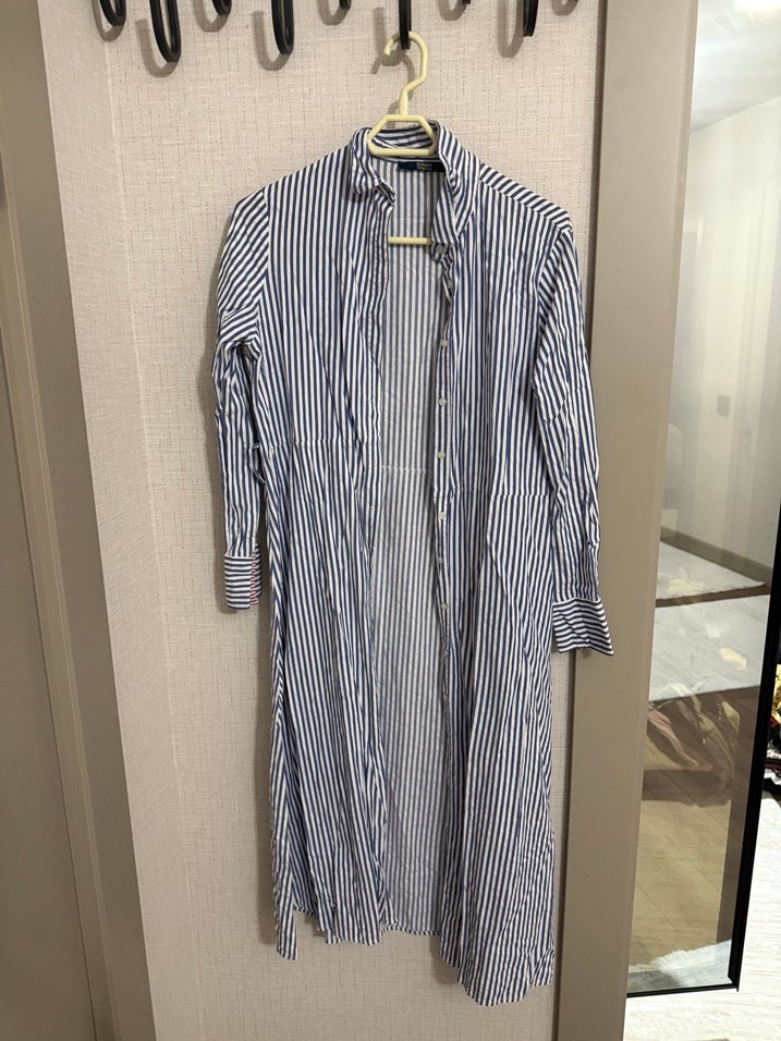 Pamuk kumaştan, çizgili ve pilili detaylı uzun kollu, uzun boylu kadın gömleği. Gömlek yakalı ve rahat kesimlidir.