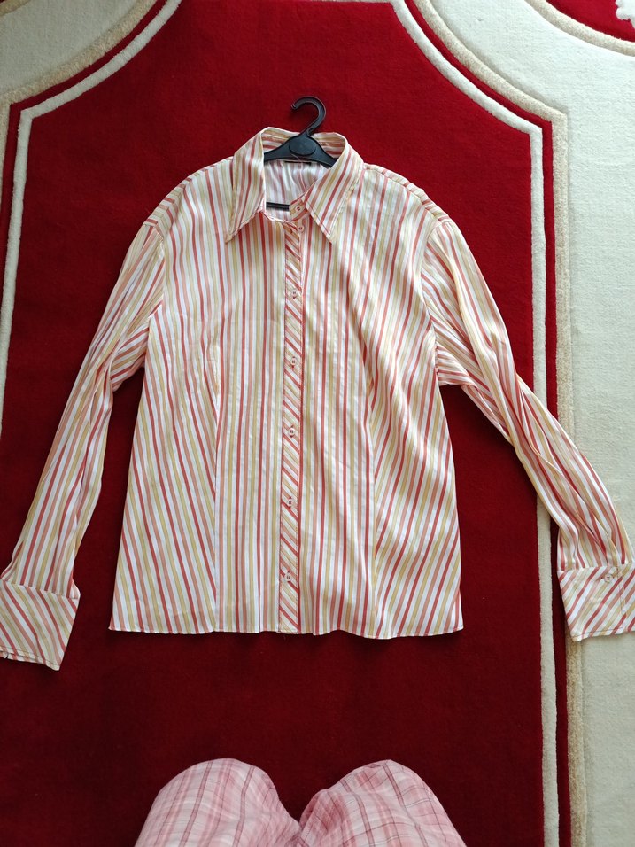 Renkli çizgili kadın gömlek, yakalı ve düğmeli ön tasarıma sahiptir. Uzun kollu ve regular fit kesimdir, ofis için uygundur. Yumuşak sentetik kumaştan, midi boyda ve rahat bir şıklıktadır.