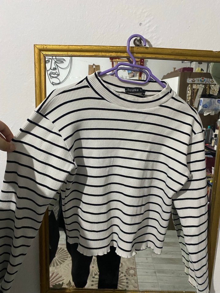 Pamuklu kumaştan yapılmış, çizgili ve uzun kollu, bisiklet yaka, dar kesim kadın triko. Günlük sokak stili için uygundur.