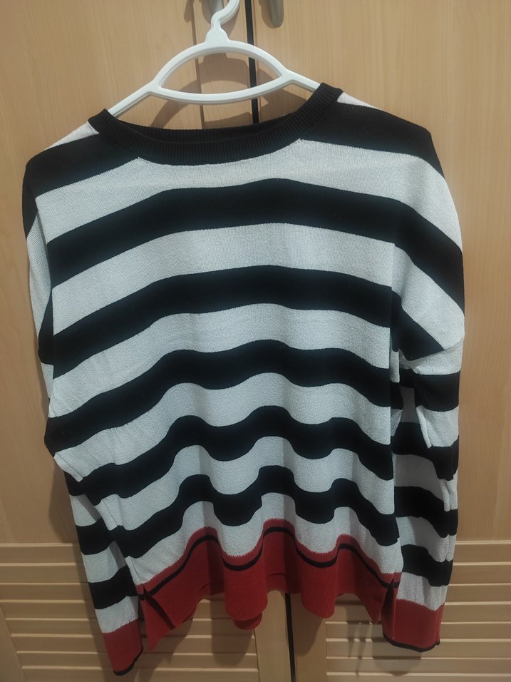 Kadınlar için uzun kollu, yuvarlak yakalı, bol kesim çizgili triko. Gri, beyaz çizgiler ve kırmızı detaylı, günlük sokak stili için uygundur.