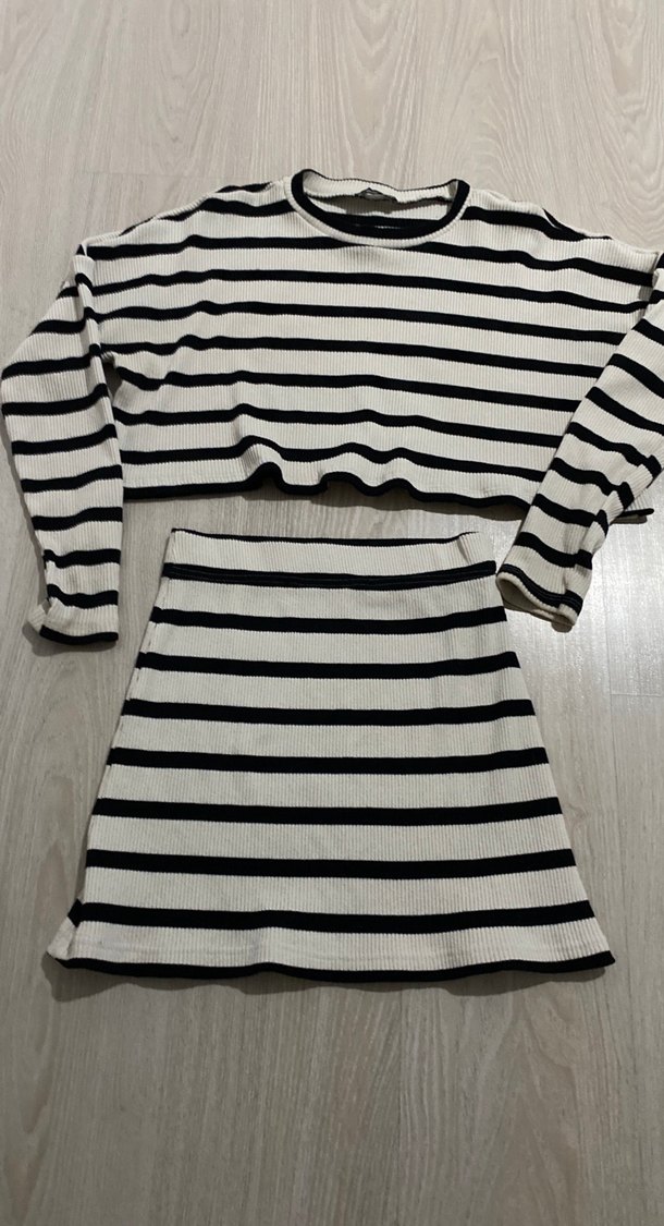 V yaka, uzun kollu, midi boy, çizgili kadın triko elbise. Beyaz ve gri çizgileriyle Paris sokak stilini yansıtan, yumuşak sentetik kumaştan üretilmiştir.