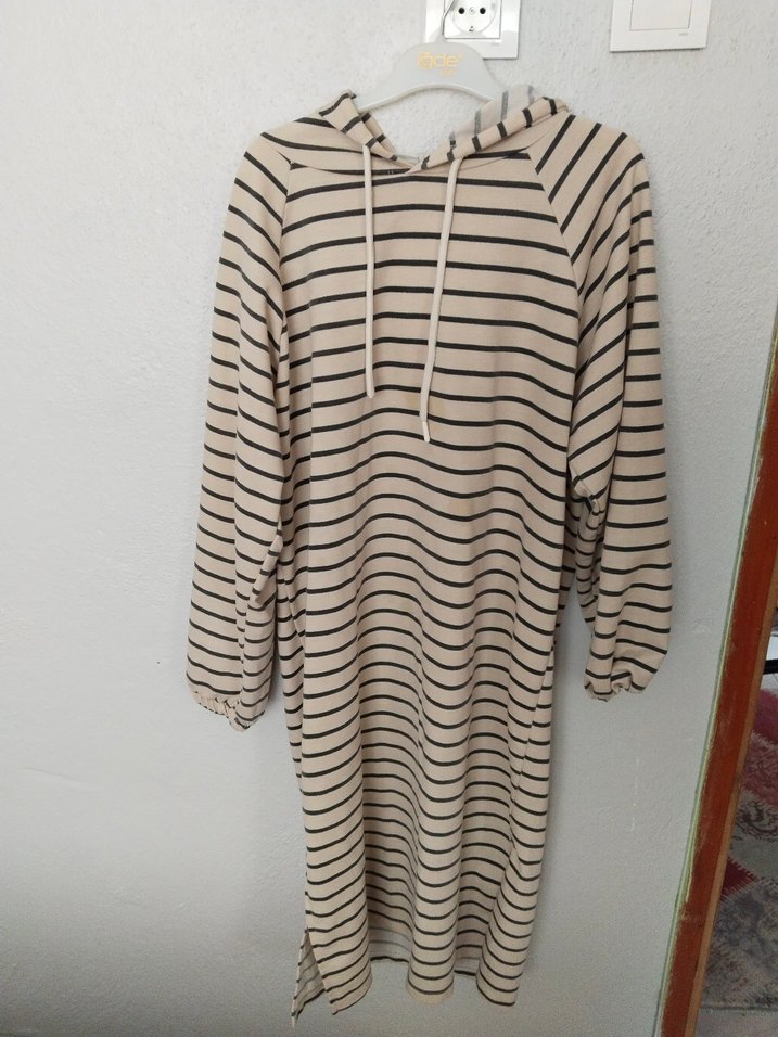 Bej ve gri çizgili, uzun kollu, bol kesim kadın tunik. Örme sentetik kumaştan, günlük ve rahat tarz için uygundur.