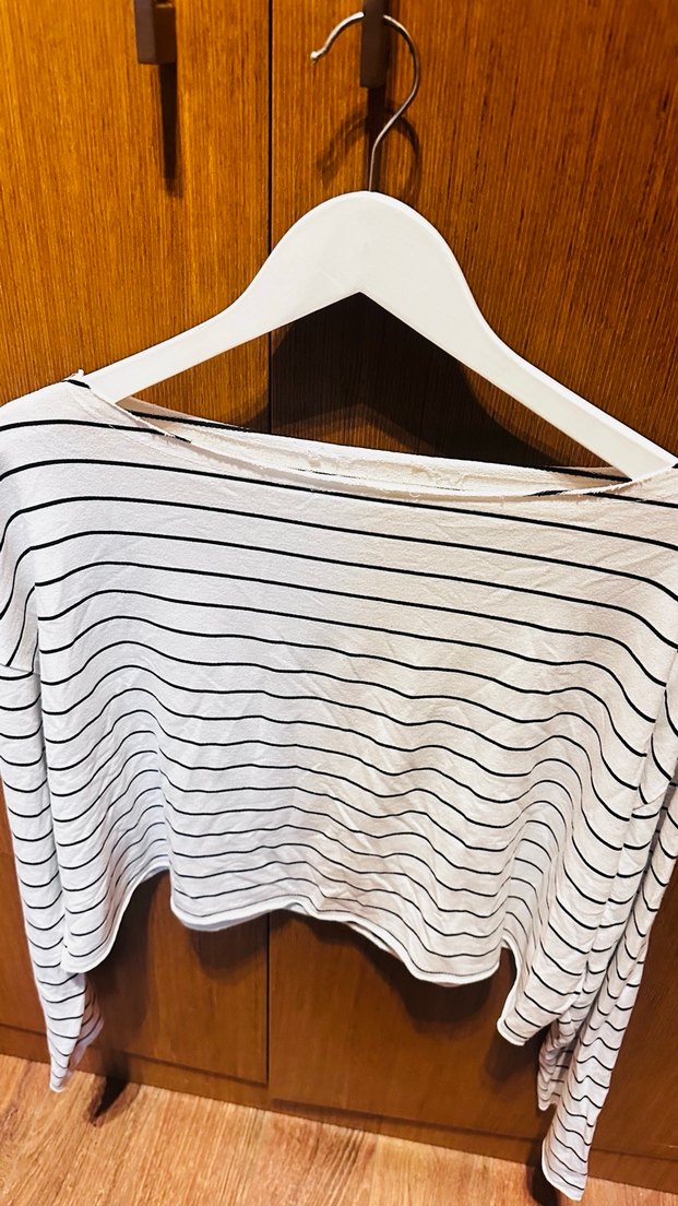 Çizgili v, beyaz ve siyah renklerde, bol kesim bluzuz.Yumuşa kumaştan, günlük rahat sokak stili için uygun.