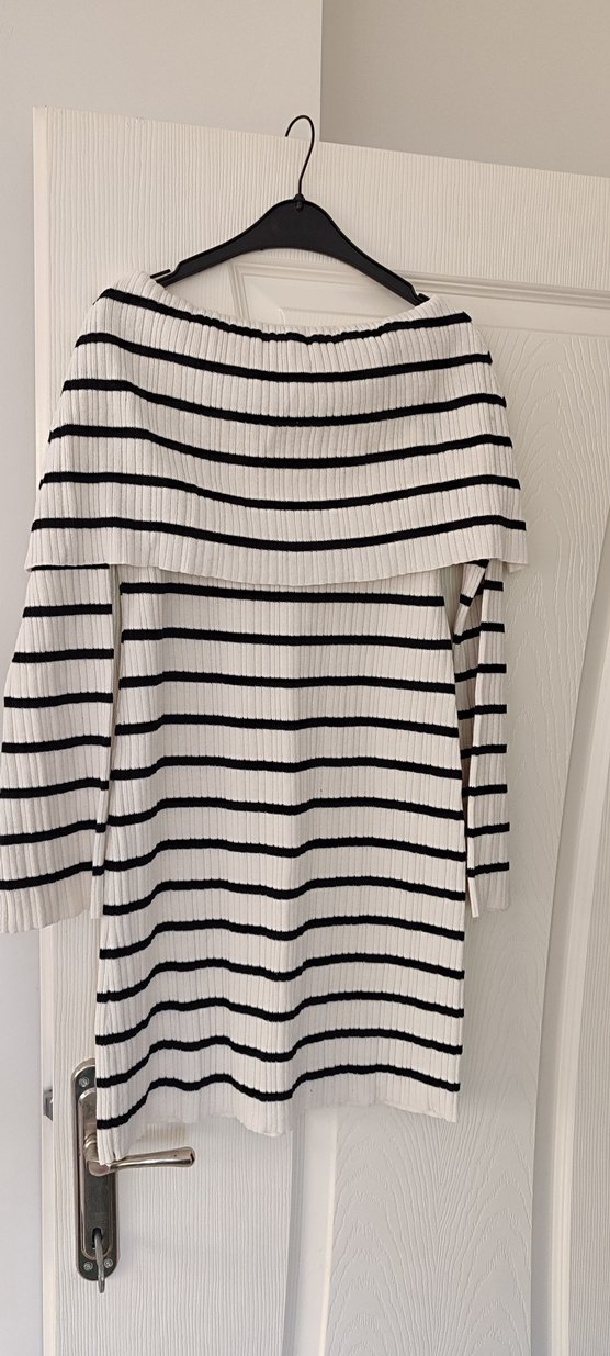 Kayık yaka ve uzun kollu, çizgili ve pileli detaylara sahip, yaka kısmı lastikli triko esnek