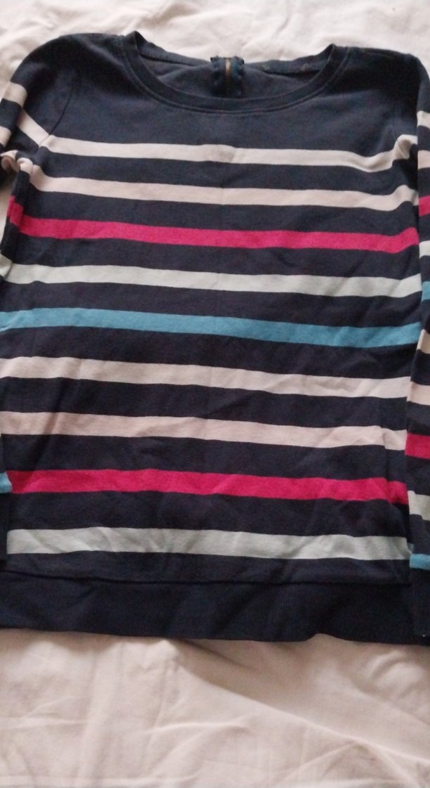 Renkli yatay çizgili, uzun kollu ve tekne yaka, vücuda oturan bluz. Günlük kullanım için yumuşak sentetik kumaştan yapılmıştır.