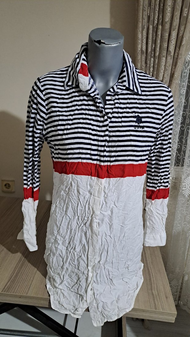 Pamuklu, düğmeli, uzun kollu kadın gömlek. Siyah beyaz çizgili üst kısmı ve kırmızı detaylı, beyaz alt kısmıyla salaş kesim, günlük sokak stili için uygun.