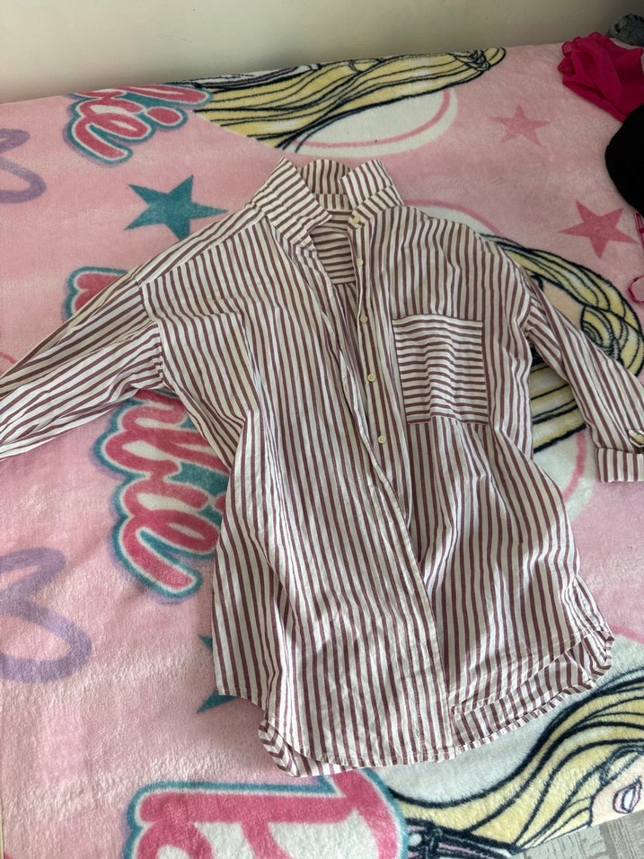 Pamuklu, çizgili, uzun kollu ve düğmeli önü olan bol kesim kadın gömleği. Pastel tonlarda çok renkli çizgileriyle gündelik kullanıma uygun.