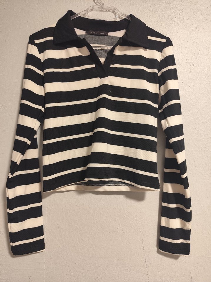 Pamuk kumaştan, uzun kollu, polo yakalı, çizgili siyah beyaz kadın kazak. Normal midi boyda, günlük rahat sokak stili için uygun.