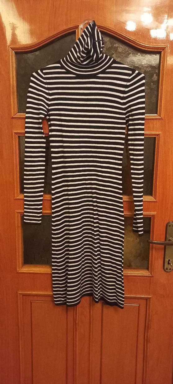 Dar kesim uzun kollu elbise, yüksek yakalı ve siyah-beyaz çizgili. Sentetik kumaştan, pile detaylı, günlük ve sokak modasına uygun. zara s beden çizgili balıkçı yaka triko elbise ürün sorunsuzdur iki kol arası 36cm boy90cm