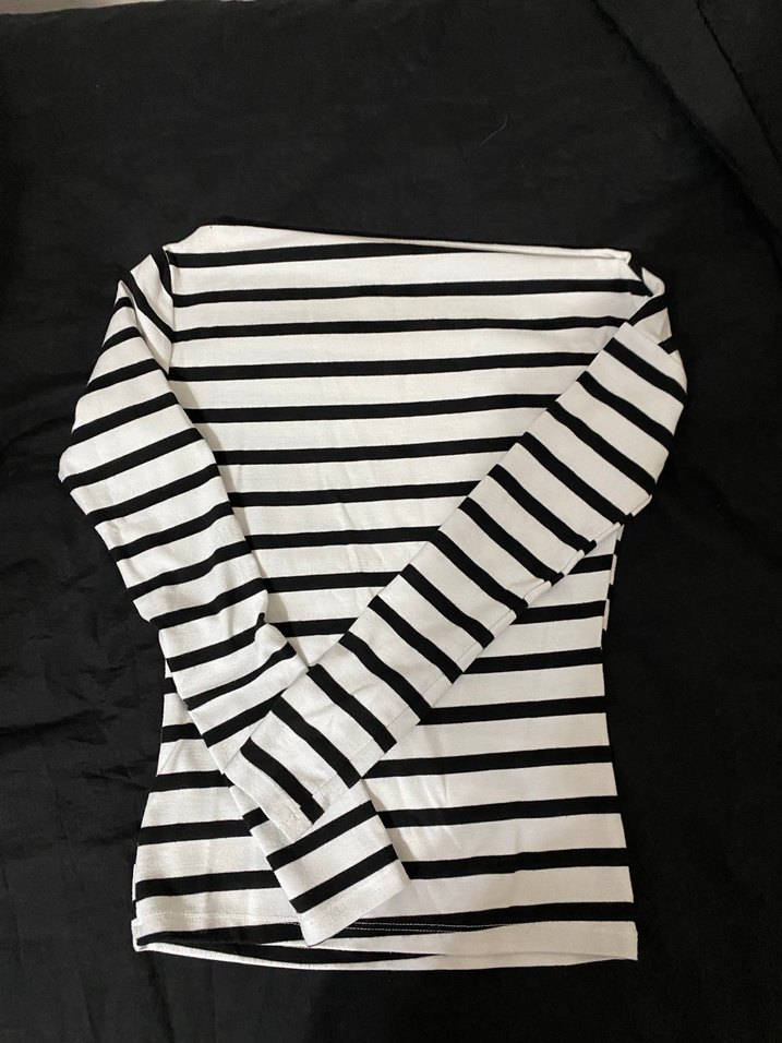 Tekne yaka, uzun kollu ve çizgili desenli, rahat sentetik kumaştan yapılmış, günlük kullanıma uygun şık tişörtü.