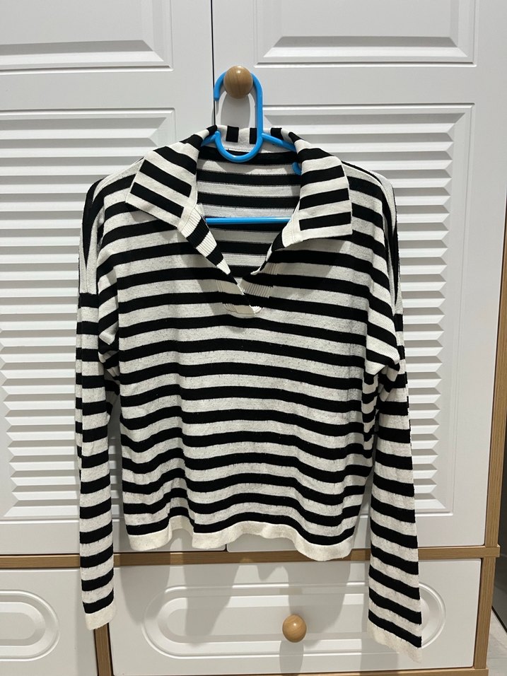 Bu örgü triko, yakalı ve uzun kollu, bol kesimdir. Koyu ve beyaz renklerde çizgili desene sahiptir, günlük rahat kullanıma uygundur.